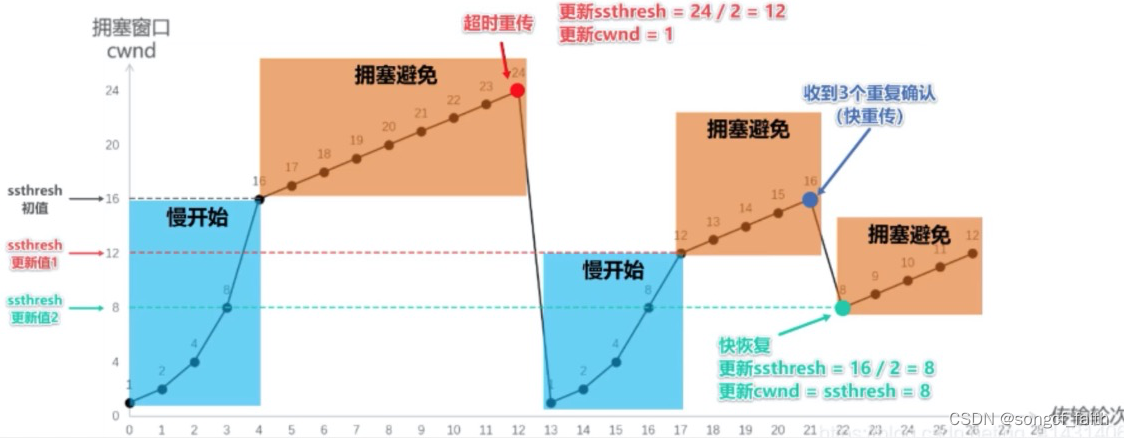 拥塞避免一直+1,直到达到N时,假设N发布在传输中丢失 x 。只有N-x段落从接收方得到了确认的答复。一段时间后,转播计时器丢失的X部分 时间快用完了根据发送者的评估,可能会出现拥堵。当出现拥堵时,改变(1)和门限制(半=N/2)。然后以缓慢的开始方法重新开始 。