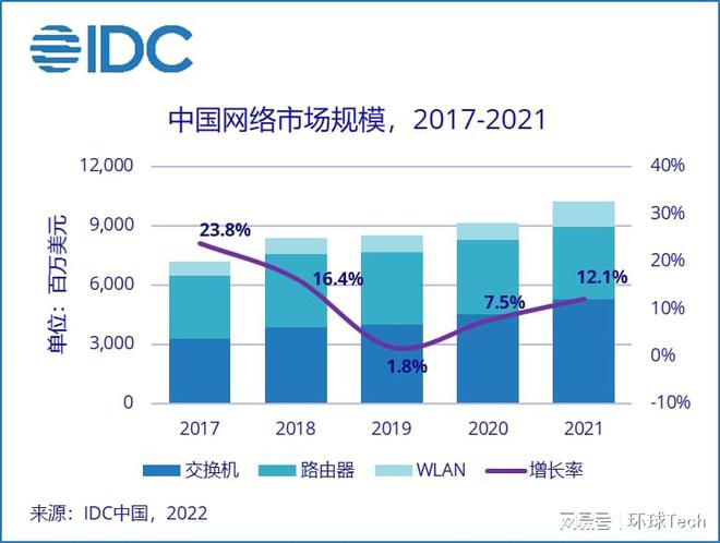 IDC:中国的网络市场将在20.21年达到102亿美元,即4亿美元,2年前路由商市场下降,66%