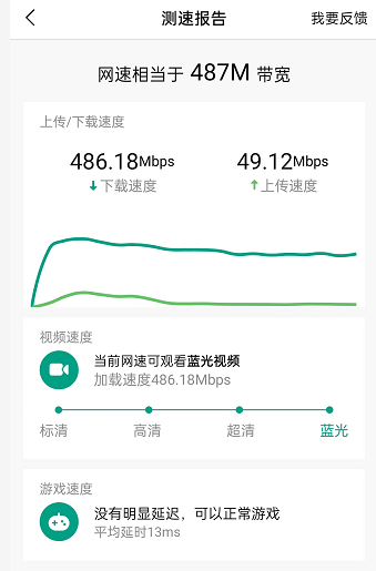 客厅里没有地方躲藏速率直接拉满。信号为-30db,下载速度约为486 mbps。上传速度约为49 mbps。我在客厅对面测试了几点信号强度波动不超过5DB。在无遮挡的情况下,网速几乎是满的。