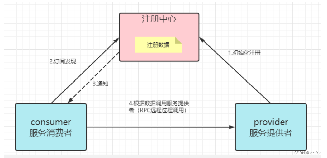第三,当注册中心注册了一个新的远程电话时,注册中心向服务消费者通报新的做法和如何拨打信息。