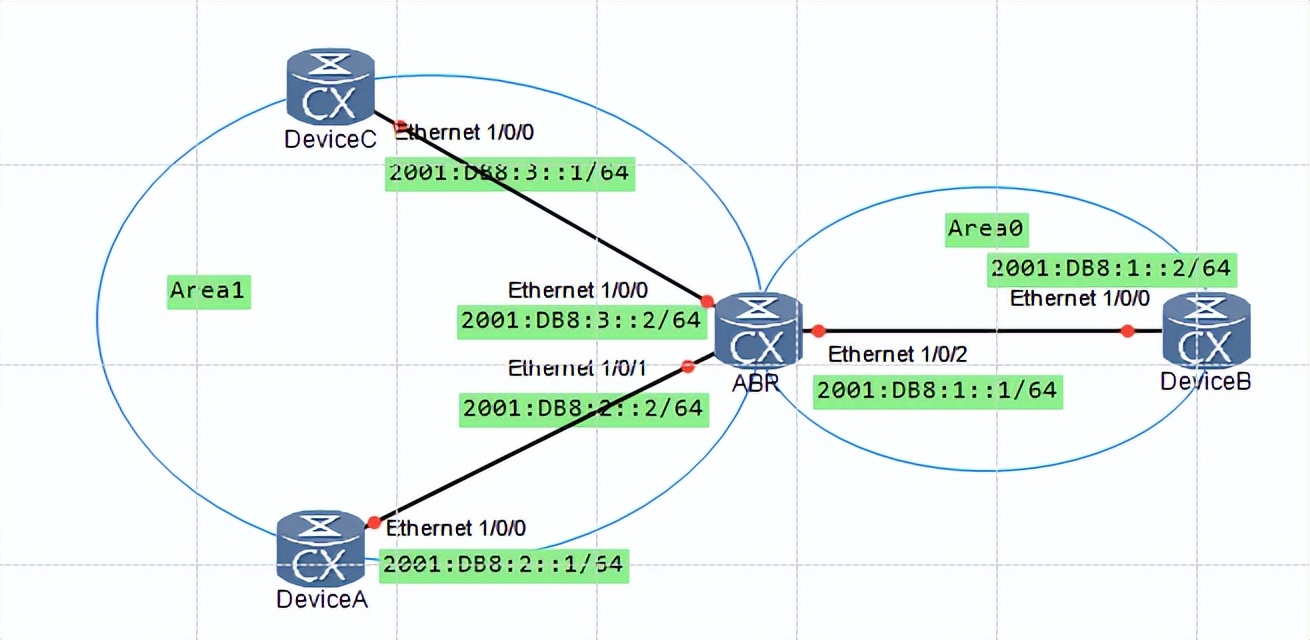 如图1所示,OSPFv3安装在所有设备上。第1区的ABR使用相同的前缀(2001:DB8:),将路由器合并成一条路线,直至2001年:DB8:32。只有这条通往0号区的路线 将由ABR出版这就是为什么我们需要缩小路线图的规模。降低管理的复杂度,此外,网络的稳定也将得到改善。