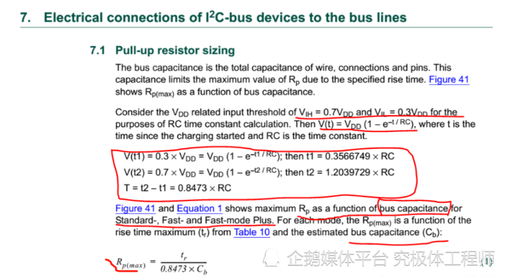 如I2C白皮书所附数字所示,在计算电阻提升时,会考虑RC过滤器的影响,该数字解释了需要考虑的数量,并提供了相关的计算方法。