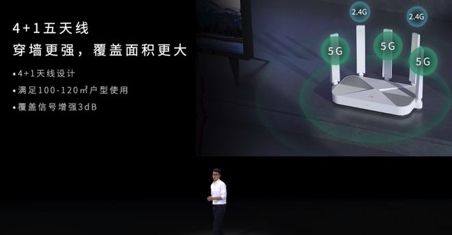 路由器有一个4+1的5天线结构,可容纳100-120平方型中型和大型住户,可提供160兆赫带宽和3 00兆字节速度。