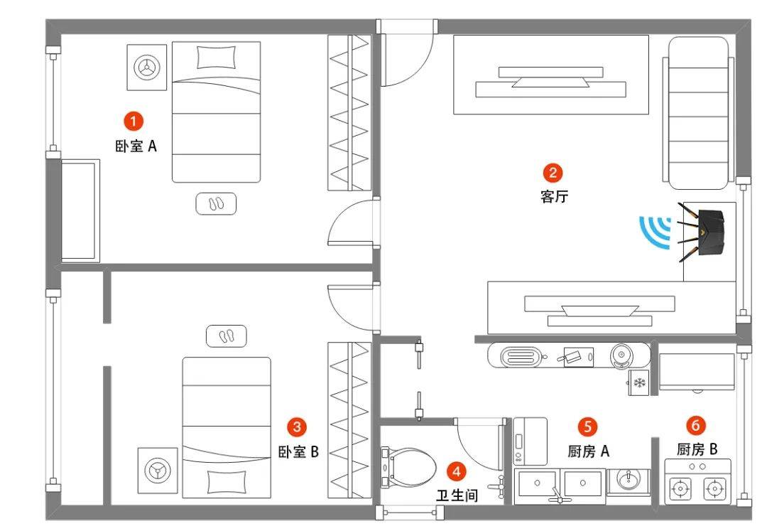 路由器的信号覆盖测试如下测试环境是一套70平方米的两间一对一的一套住房。根据日常活动,我们会在房间里6个不同区域 做5GHz信号强度测试当我们尝试时,我们把该地区变成了一个更强大的澳大利亚。家庭互联网环境为500米电信宽带。测试中使用了米10型手机。