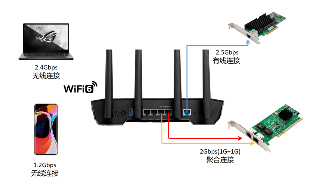 TUF-AX300的最新迭代引起了许多关注。通过刺杀模型,主要是路由器能够与AX5400性能水平相竞争。就理论最高无线费率而言,TUF GAMING的强化电气旋风只支持 2x2 MU-MIMO。因此,其5GHz网络速度仅为TUF-AX300(4804Mbps)的一半。所以替代产品 似乎是从超级模型下台的一步?其实也不尽然,TUF GAMING 电动小气旋 用2.5G Wan嘴。局域网门户提供链接联合,理论上与200Mbps宽带连接连接,但可用作促进链接整合的工具。标准AX 300路由器最多只能处理几兆字节带宽。现在我们通过性能测试调查路由器的能力