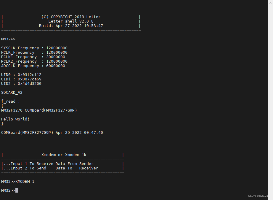 程序启动后,MobaXterm终端显示书面信息。键入第一个命令时,MSCU作为接收方,通过SecureCRT从计算机获取数据内容,这是唯一的数据来源。当输入二号时MCU作为发射机运作,在PC上向安全CTT发送数据。SecureCRT 保存在指定位置指定的文件中接收的数据 。