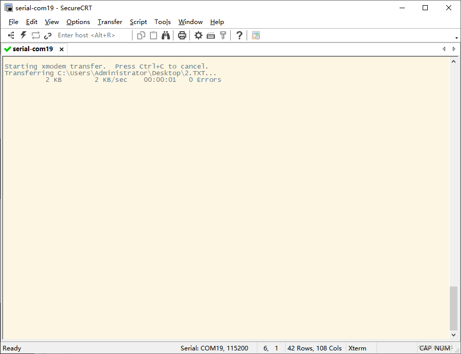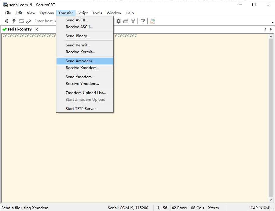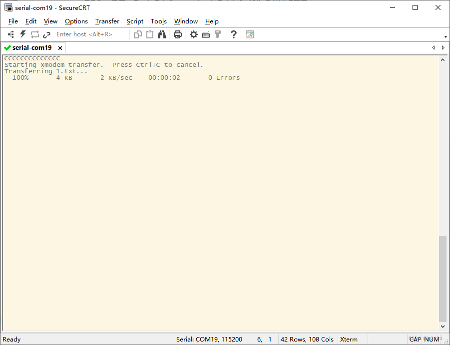 1 、使用 CRC 的校验方式进行测试 :在MobaXterm终端中,将 XMODEM 1 命令输入接收 Xmodem 数据状态。此时 SecureCRT 程序窗口定期显示大写字母。 C;通过点击Transfer->Send Xmodem...在弹出的窗口中,选择需要发送的文件1.TXT,点击Send后即刻发送数据。