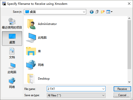 3 、使用标准 Xmodem 协议接收来自 MCU 的文件数据 :在 MobaXterm 终端中,将 XMODEM 2 命令输入 Xmodem 数据状态。等待 SecureCRT 软件提供启动字符,以便开始传输; 从程序打印中学习,当Xmodem获得安全CRT软件时《儿童权利公约》是使用的核查机制。在SecureCRT软件中通过点击Transfer->Receive Xmodem...在弹出的窗口中,选择要保存的文件的目录和文件名。 例如, TXT 。点击“接收”时,将接收数据。
