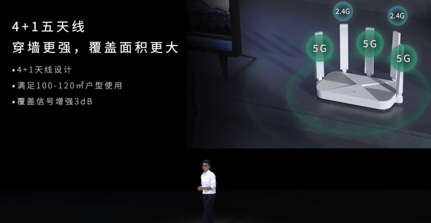 该路由器支持160MHz 频宽,其速度为300兆bps和4+1 5天线设计,以覆盖100-120 平的中大户型。