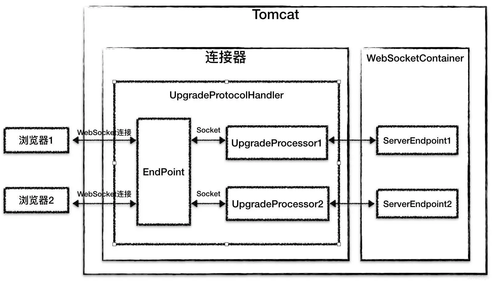Tomcat的WebSocket请求没有通过服务器容器发送。相反,该请求通过升级处理部分直接转交ServerEndpoint案。因此,Tomcat的WebSocket软件实施不需要侧重于独特的I/O模式。结果,具体I/O模式脱钩。