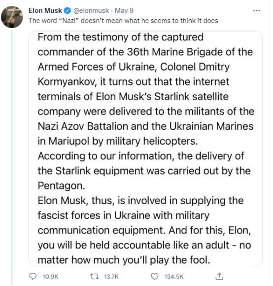 上午9时45分-9时"纳粹"一词不是他所认为的, 我不知道我该怎么办"下面的文字是文字的截图。这是Rogozin的文本, 8在电报上。罗戈津在文中表示,被扣押的乌克兰海军第36旅参谋长Dmitry Komyankov说,SpaceX的“星链”卫星系统地面终端硬件,武装部队被军用直升机空运到“纳粹组织”Acent营和乌克兰海军。对此,罗戈辛宣布穆斯克是指挥官↓
