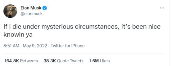 之后在晚上8点51分, Musk在推特上说:“如果我死在无法解释的情况下,