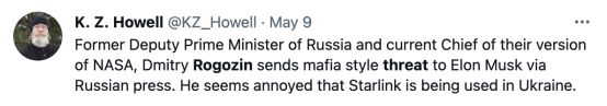 Rogozin对此也表示兴趣。并做出回复。9日,Rogozin分享了他对在Telegram上伪装的“神秘死亡”推特的答复的截图。根据截图,罗戈津称,“没人需要你,别胡闹。这是我国美丽的节日 — — 战胜法西斯主义的日子。遗憾的是,在你向乌克兰纳粹送去军事通信卫星之后抱歉我不能祝你圣诞快乐埃隆,请想想,你站在哪一边。”↓