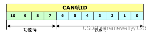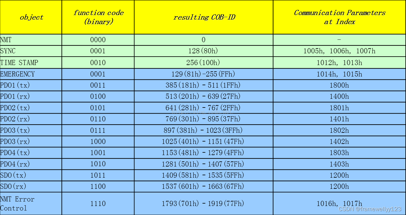 Canopen的通信对象身份(称为COB-ID)继续使用标准框架中的11位位码,但核准的4位(7-10位)功能代码和7位(0-6位)节点身份(最多容纳127个节点)除外。