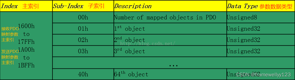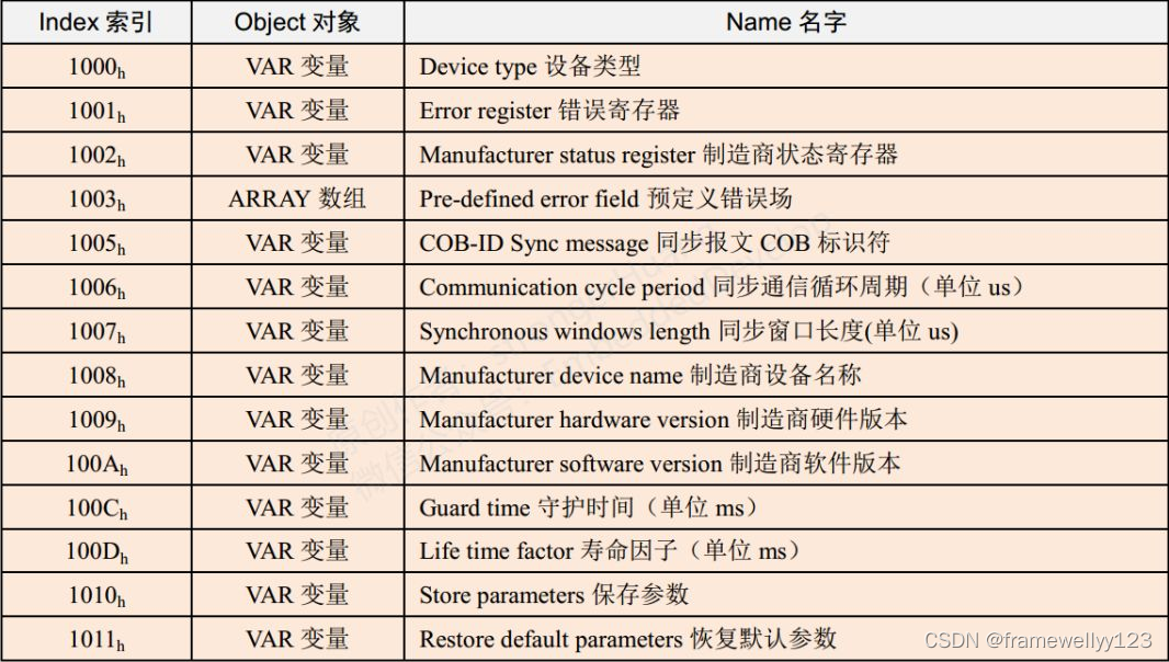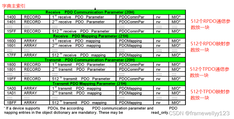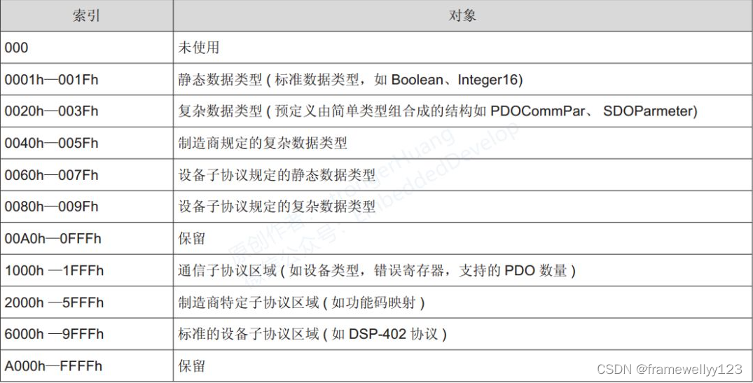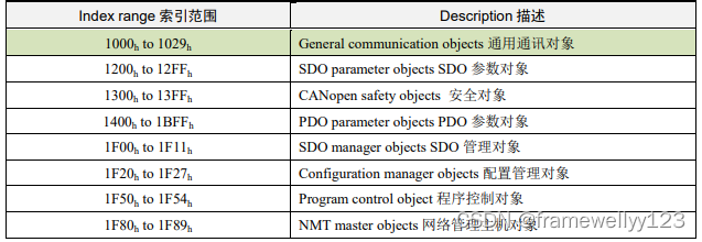 对象词典的内容分布在下面的表格中。全球统一,但具体细节由你决定下图左侧的索引,是字典条目的索引编号,COB -ID与它无关。对象字典索引实际上被分隔为16位主索引和8位位子索引。下表仅显示了主要指数。