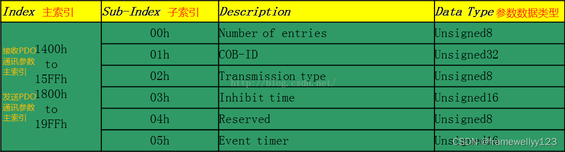 如前所述,一个节点可支持4个TPO/RPDO配对。每个PDO都配备了两套参数:通信参数和地图参数。每个参数组(而不是每个参数组)指定一个主索引号。因此,一个节点使用16个基本指数数字储存参数。对于128个节点,将使用128个主要指数编号(0x800)。字典索引号从 0x1400 开始 。0x1BFF的结尾