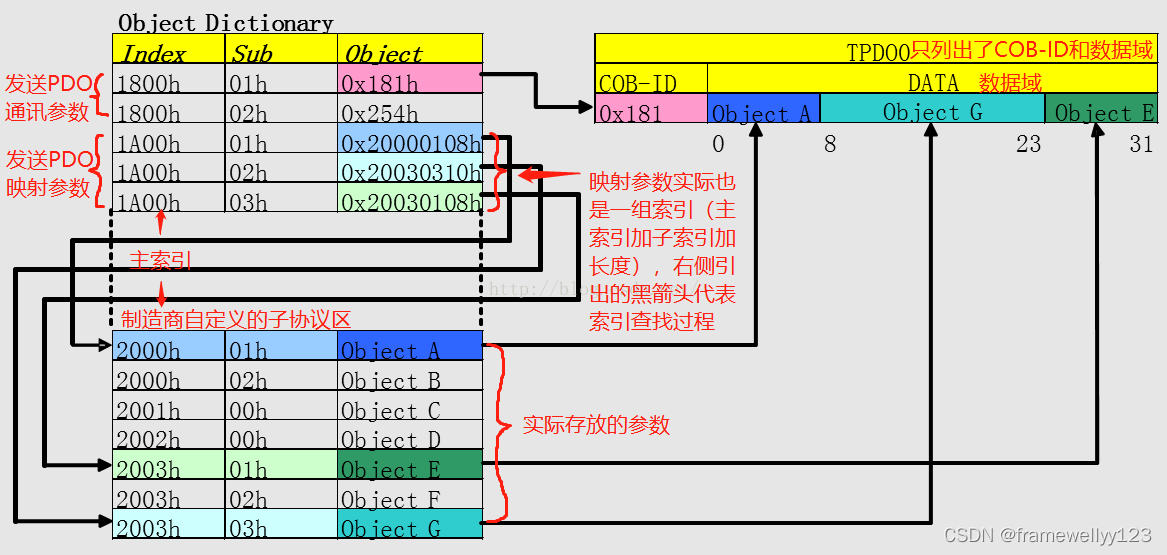 在[18001](coma)之前,第一生产者指定了初级指数。逗号后表示子索引,我不知道你在说什么 但我不确定你在说什么 但我不确定你在说什么在此之后,从[1A00,01]获得第一件物品。[1A00,01] 值为 0x200108。因此,[200,01]是第一个项目。对应值为A,从PDOs的 0x8。然后是第二个目标[2003,03]。对应值为G,0x10(16)占建设和平支助办公室总数的0x10(16)最终目标[2003,01]对应值E,从PDOs的 0x8。A、G和E(按此顺序)然后建立一个32位TPDO数据字段。