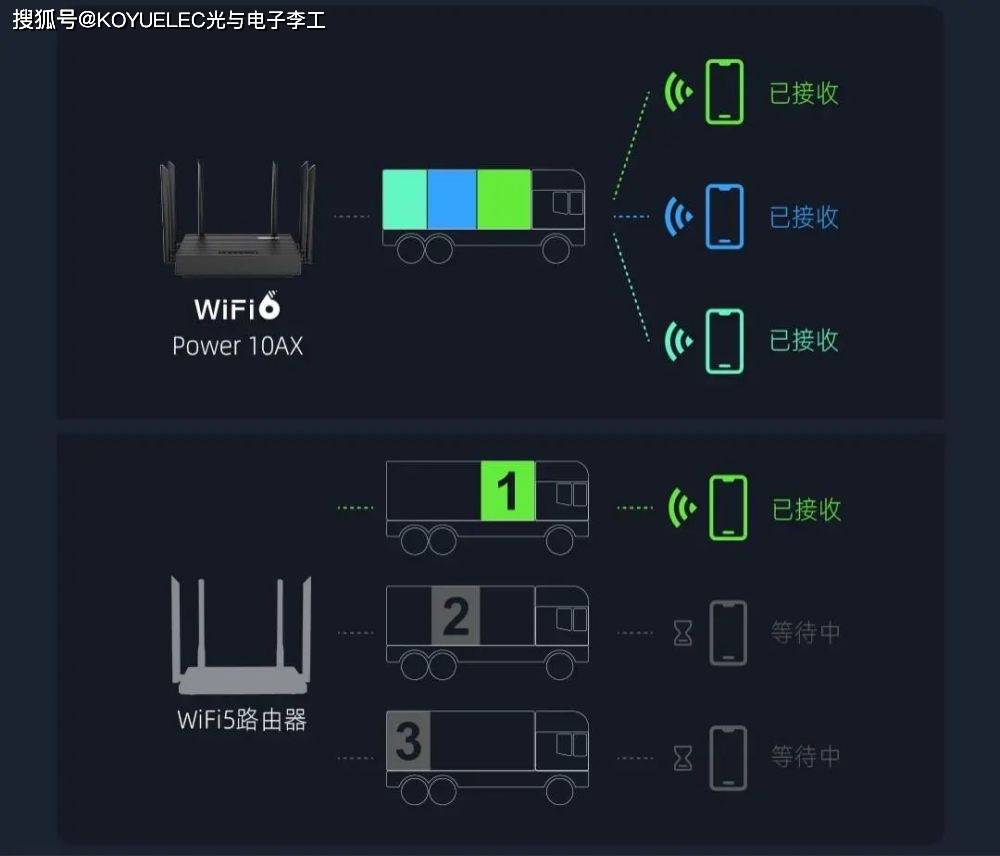 MU-MIMO技术在WiFi5中已经使用,与MU-MIMO只能下降的WiFi5不同,WiFi6可过度接收和过度接收,对8个数据流给予最大支持,从而增加无线网络的宽带消费。