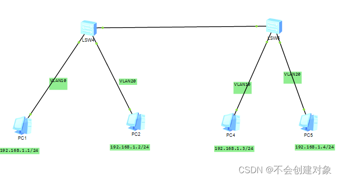 PC1可进入PC3,但PC2和PC4无法与其他两台计算机连接,因为PC1和PC3以及LSW1和LSW2的港口是VLAN10,而PC2和PC4是VLAN20。