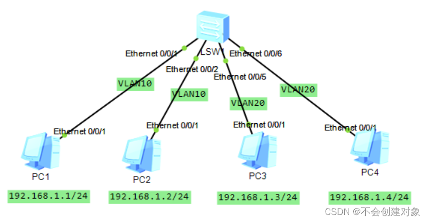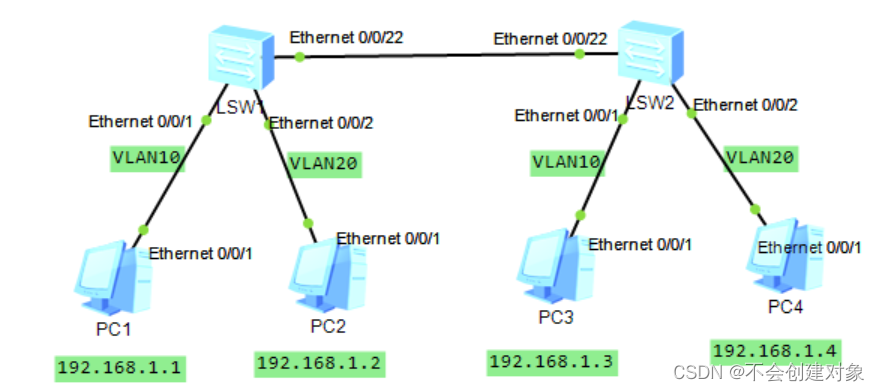 由于PC1和PC3的港口分别属于VLAN10, PC2和PC4的港口分别属于VLAN20, 两个交易所的港口在VALN1的默认港口之间没有区别。