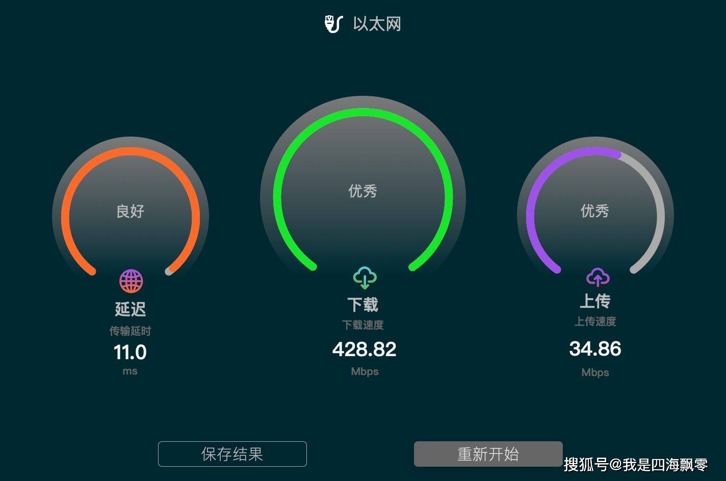 有线连接,11.0毫秒的传输延迟,428.82兆秒的下载,34.86毫秒的上传。