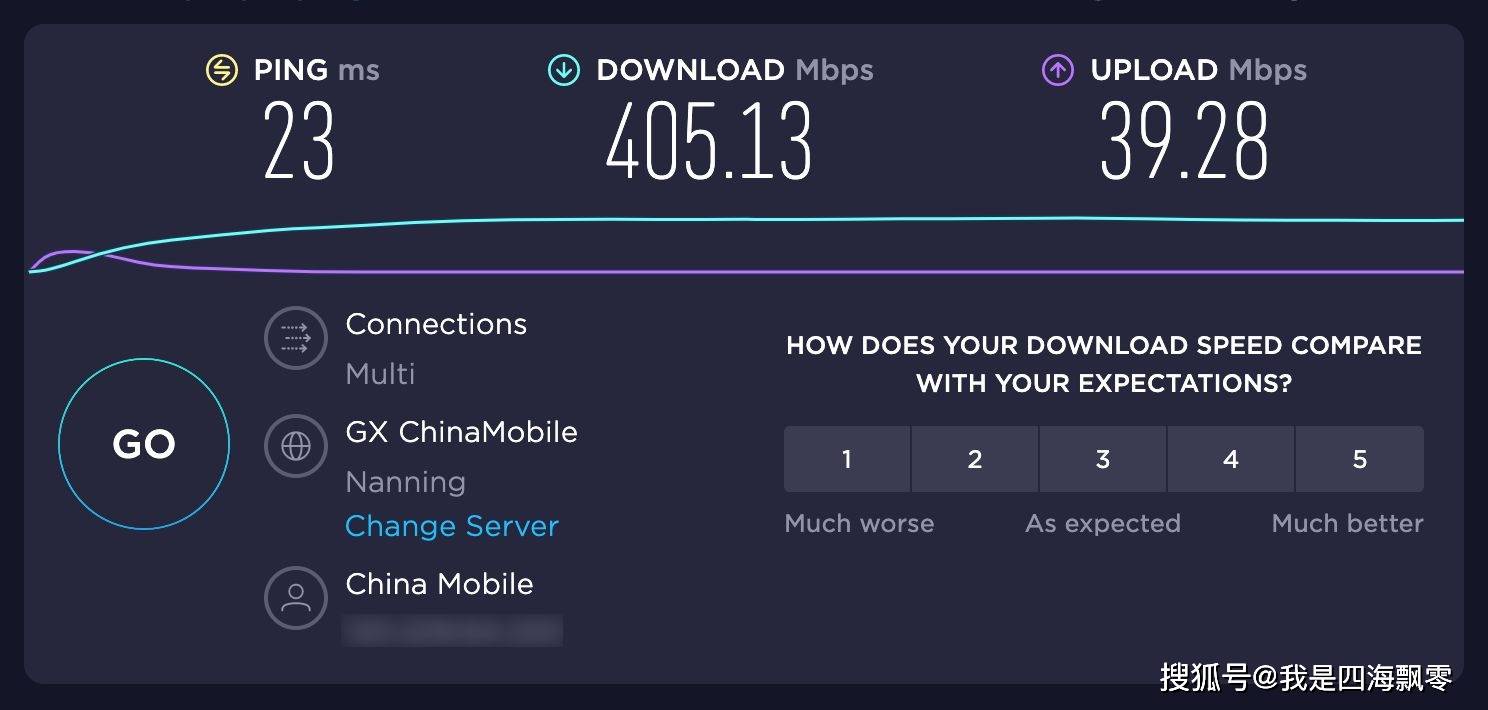 5G连接,传输延迟度23.0毫秒,下载速度405.13兆位/秒,上传速度39.28兆位/秒