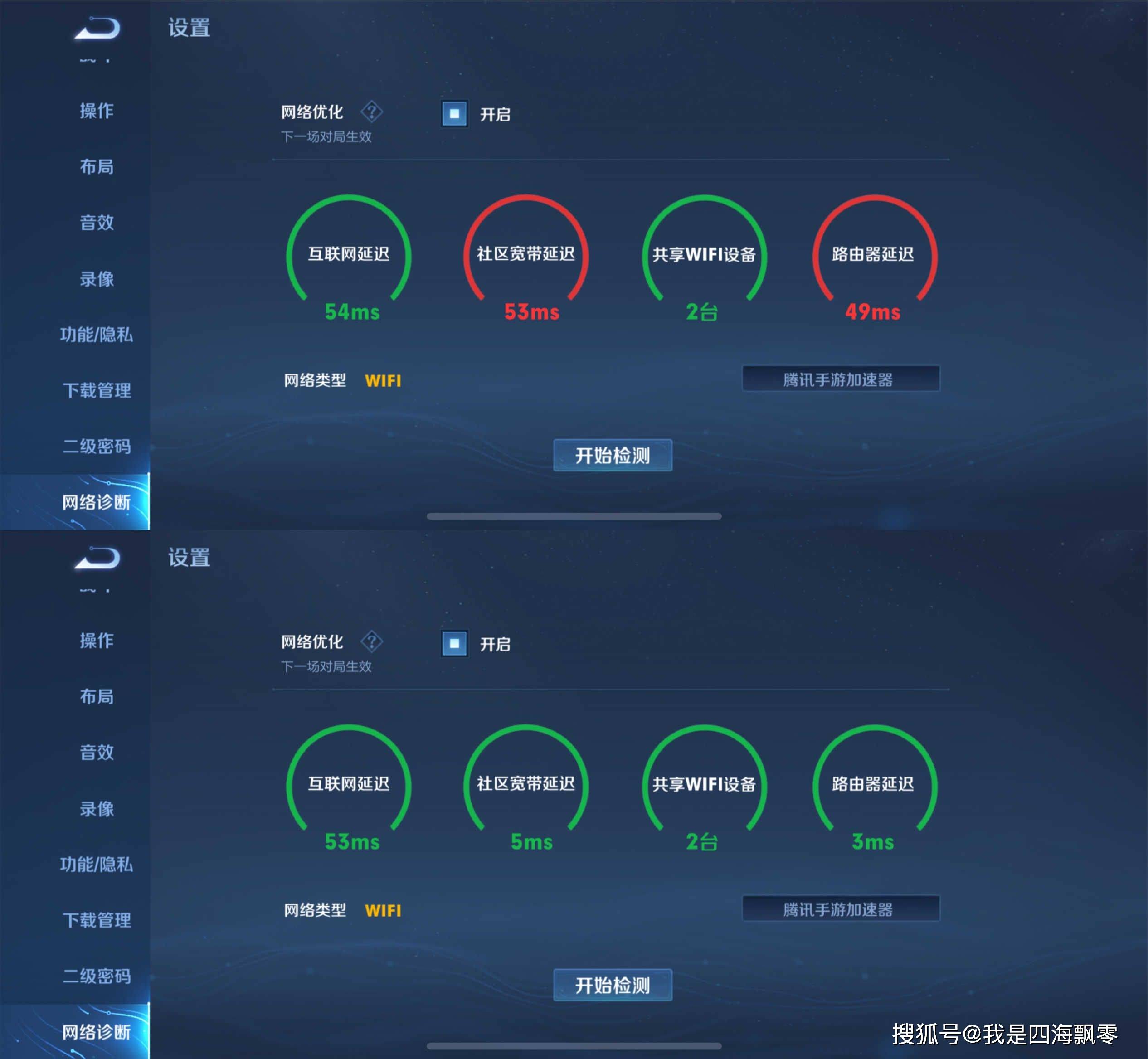 MIFON X1 电路路由器的速度是用流行的皇家光荣来衡量的。QOS游戏尚未启动, 无法测试国王的光荣在线诊断是否在两个点上重新显示。社区路由器的延迟时间为53米,路由器的延迟时间为49米。当启用 QOS 游戏时, 国王荣耀中的网络诊断都是绿色的 。社区区间延误为5米,路由器延误为3米。