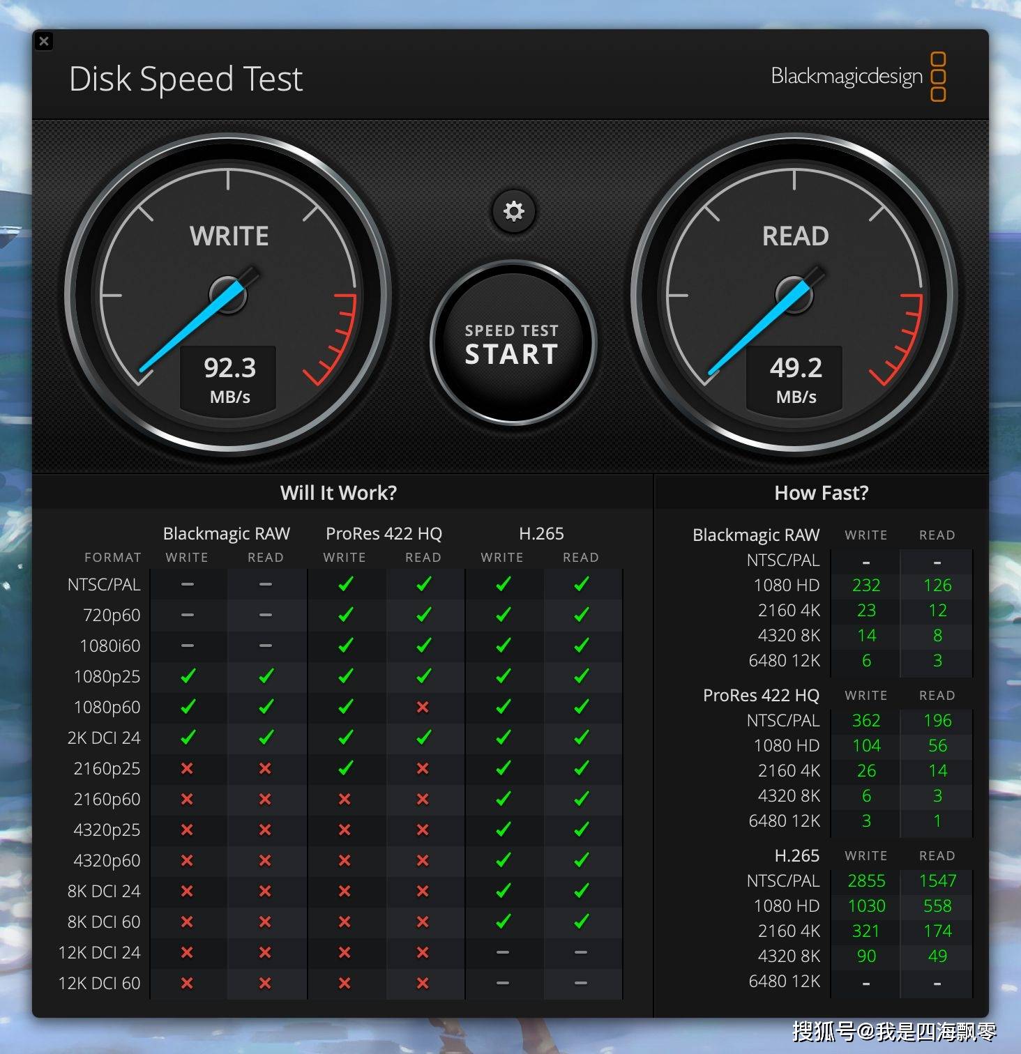 Mac的磁盘速度测试用于测量数据,在读49.2 MB/秒时以92.3 MB/秒计算。