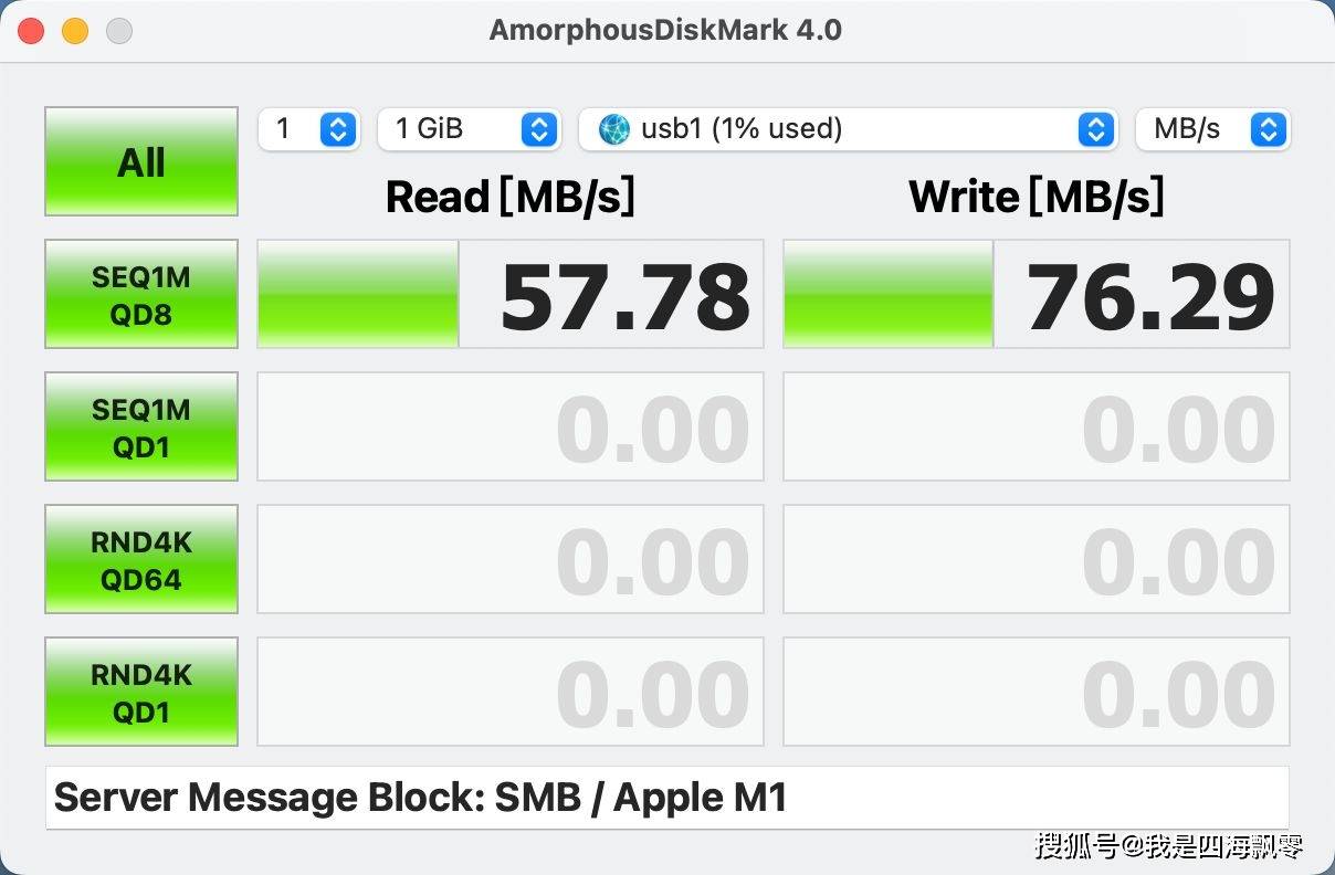 数据(1GiB)用Amorphos Disk Mark 3.1:连续读数:57.78 MB/s,顺序写法:76.29 MB/s。