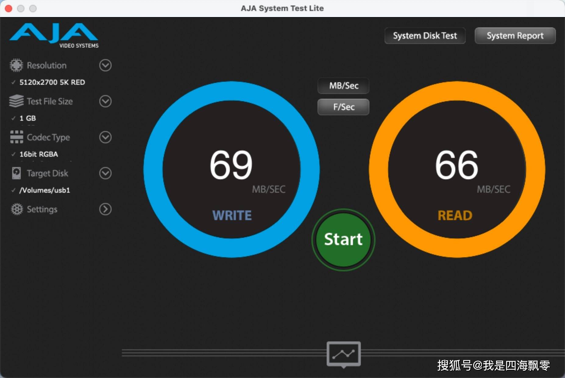 连续写:69 MB/s,连续读数:66 MB/s,使用AJA系统测试利特(1GB)测量。