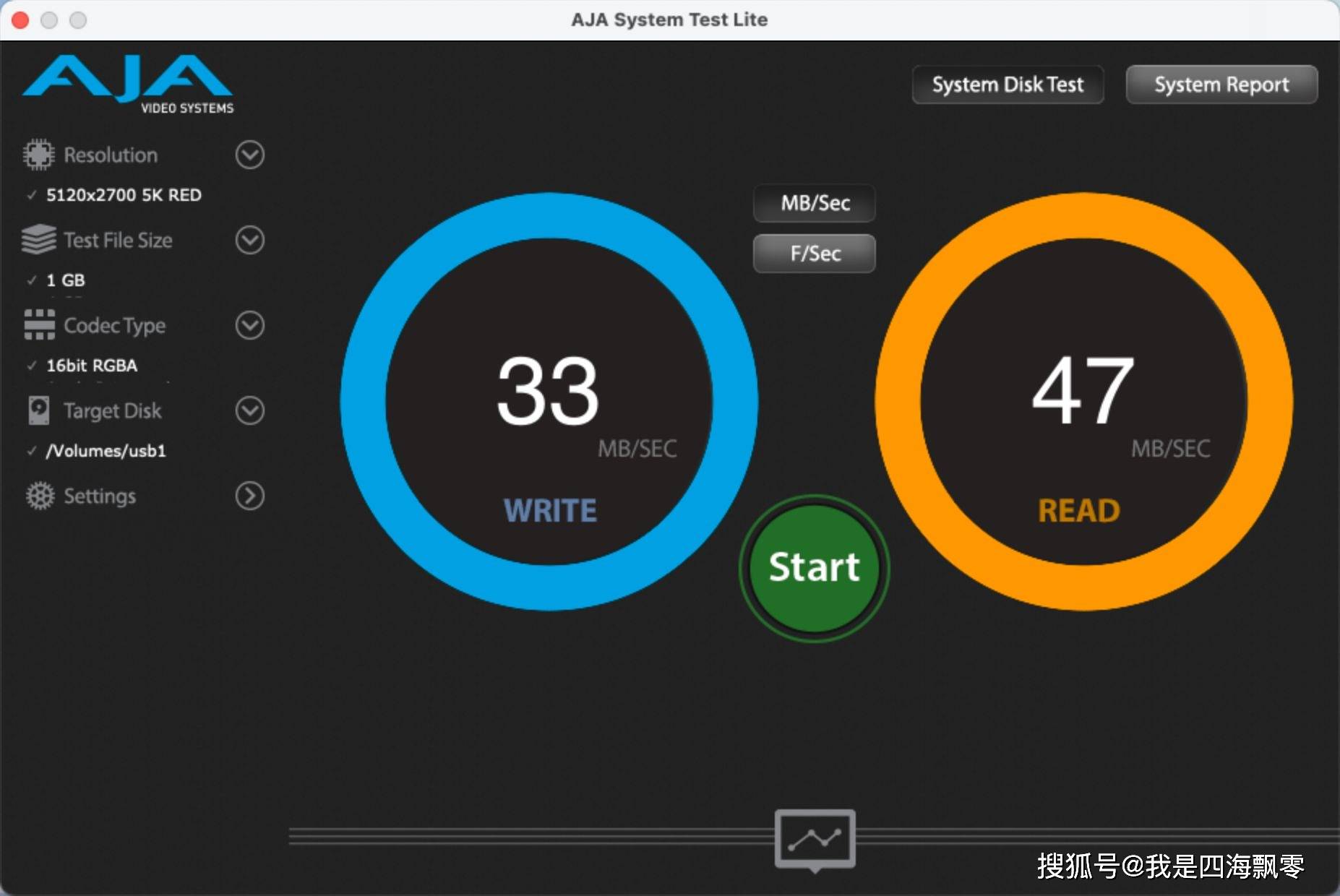 连续写作:33 MB/s,连续读数:47 MB/s,用AJA系统测试利特(1GB)测量。