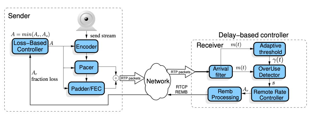 接收端使用基于时间的算法。单向延迟和卡尔曼过滤器用来估计目前的传输延迟。此外,可以根据目前实际接收带宽的情况确定适当的目标带宽。RTCP 信息反馈给发件人发送者选择两种算法产出中最低的一个作为最终目标带宽。