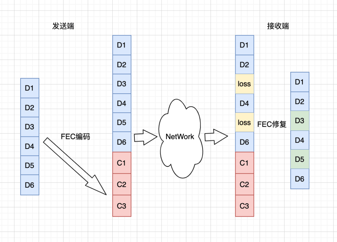 FEC的基本想法是,除了提供视听数据包外,发送者还发送了固定数量的多余数据包,以便在接收端进行处置回收,视确切的下降情况而定。