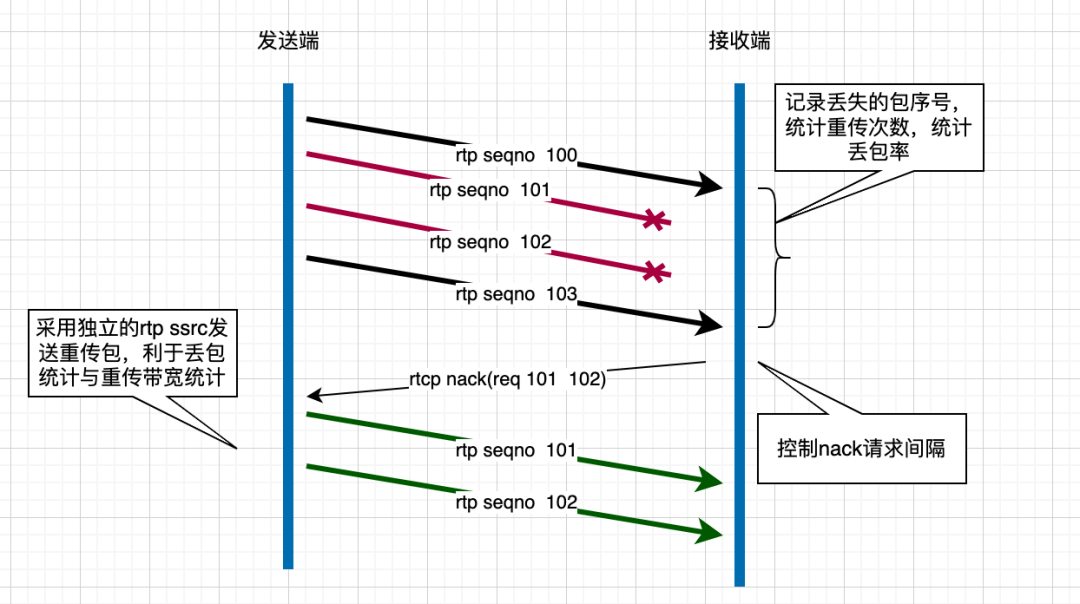RTTP/RTCP协议中的回溯办法只是,接收端根据包件序列号的连续性选择是否丢弃包件,办法是将RRTCP中的NACK请求发送给源头,并要求源头重复指定的数据包。