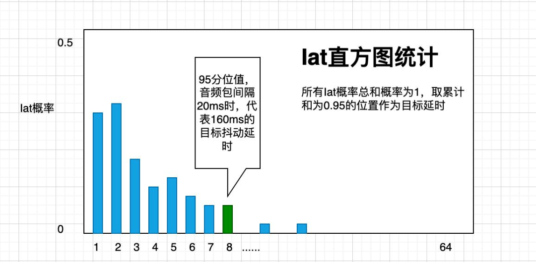 WebRTC估计其内部NetEQ模块的音频振动延迟,图中的Iat表示,差距接近时间,WebRTC使用直方图计算音频包之间的间隔,需要95个分数延迟,因为音频振动延迟估计其内部NetEQ模块的音频振动延迟,图中的Iat表示,差距接近时间,WebRTC使用直方图计算音频包之间的间隔,需要95个分数延迟作为音频振动延迟。