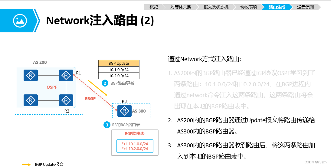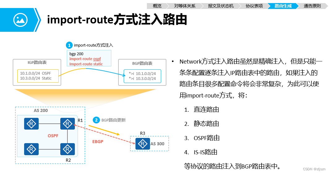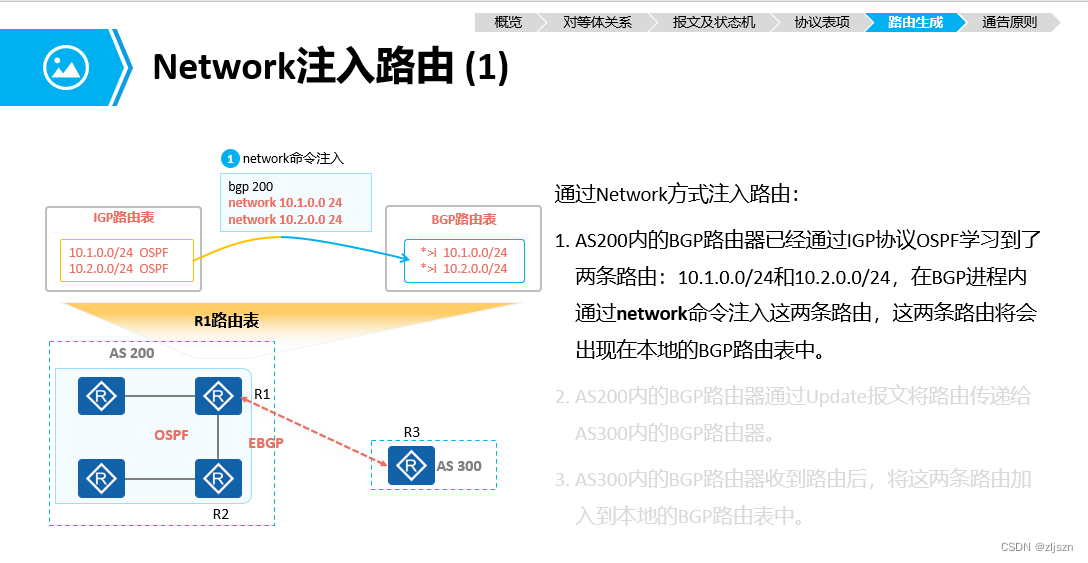 与IGP不同,BGP在建造邻居后不会提供路线。 需要人工注射:第一种方法是网络工作。