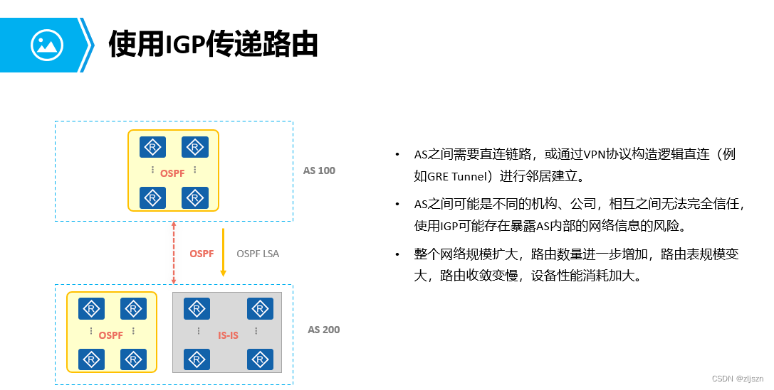 1. 与IGP合作,改变道路。的话可能会导致内部信息泄露的风险,因为IGP之间的传输是完全信任的,所以会根据单个路由器的lsdb知道全网拓补,所以总的来说是不安全的,另外的话IGP的承载量也非常有限