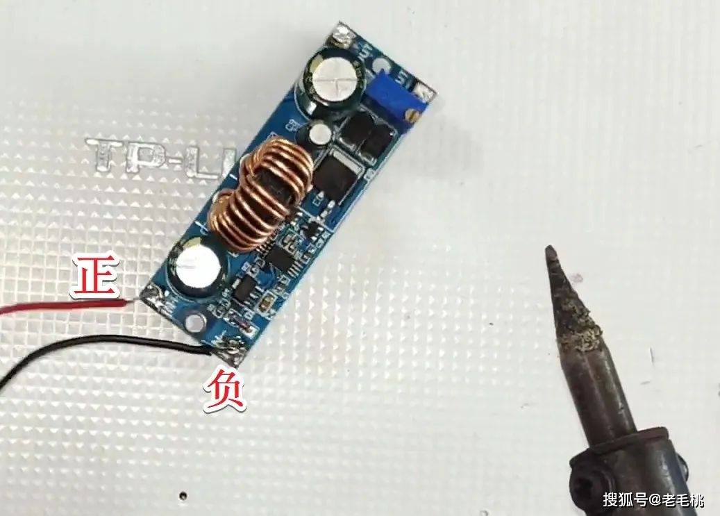 2. 将电池焊接到加压模块输入的末端,注意将正极和负极分开。