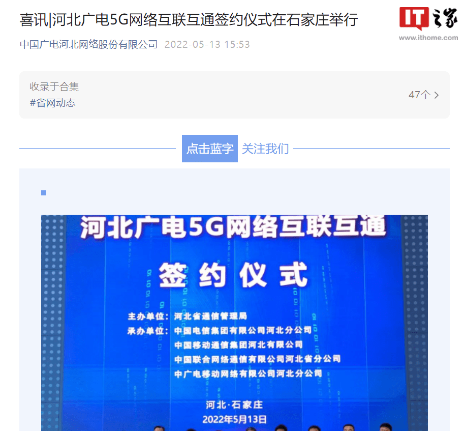 IT Home,5月15日,根据中国广台北网络有限公司的资料,5月13日,由河北省通信管理局协调代之以宽带电电、连通电、移动电河北省首府河北省世家三家基本电信公司5G签署了互联网连接协议。 该协议的签署标志着河北省四家5G企业的成立:电信、移动、连接和宽带。进入重大推进阶段。