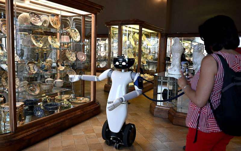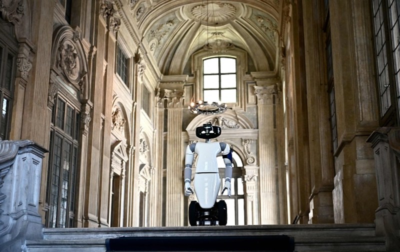 5月12日当地时间,意大利理工学院的人类机器人R1陪同游客来到都灵的玛达拉宫,该机器人可以描述作品并回答关于作者或其所属历史时期的问题。