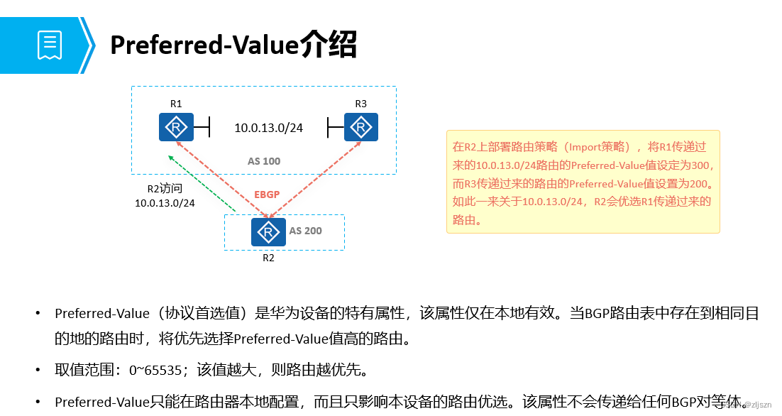 本地偏好属性值越大, BGP 路径越好。 默认本地偏好值为 100 。