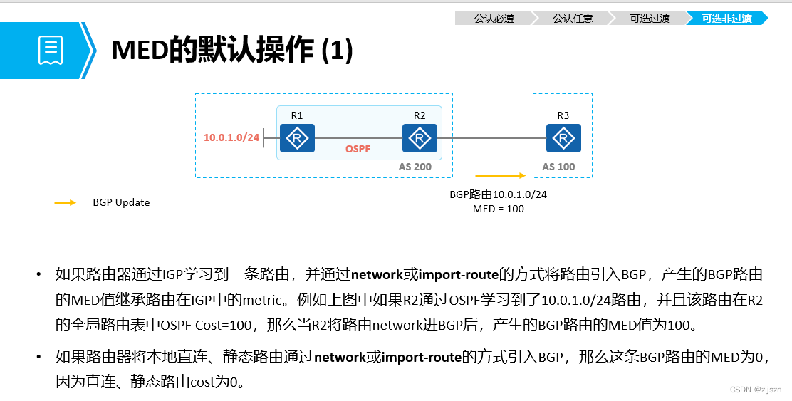 一. 如果 BGP 路径是本地(通过网络或进口根指令)建立的,则将MED 属性默认地携带到 EBGP 对等点。
