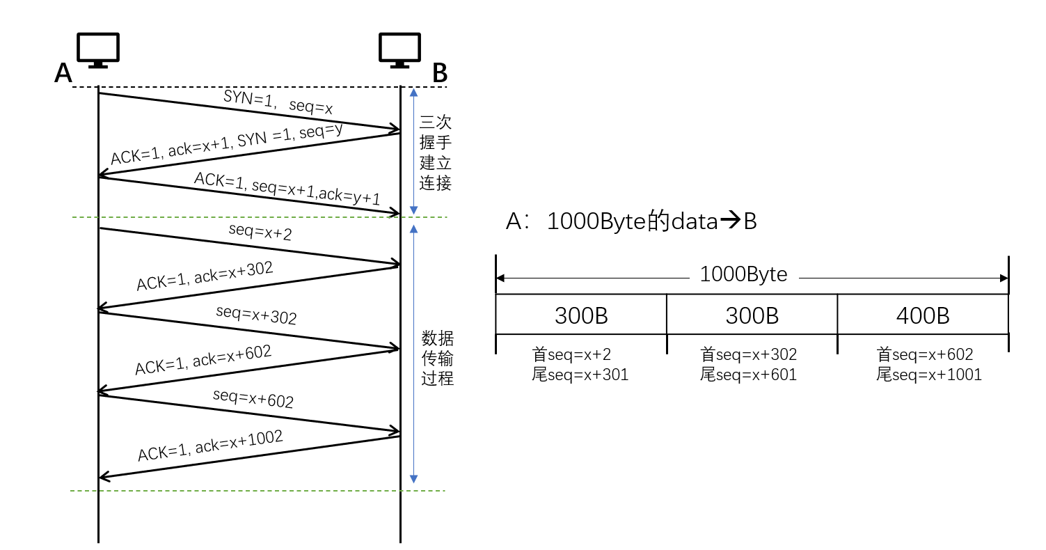排序机制:每届TCP会话以32位(位)序号结束。序列号用来记录在该端提供的数据数量。每个包包都包含一个序列号。接收端使用确认号通知发送者成功收到数据。TCP为每个数据字节指定了一个数字。保证可靠性,为确保为达到最高效率对数据进行适当排序,可实现多次发送,要删除重复的数据,需要确认一次。如图,A必须把100字节送到BA 以数据项开头,前300个字节的初始传输如下:第一字节后继=x+2。传送的最新字节数据为后数=x+301。在B拿到数据的最后字节之后发出确认,后数=x+302;第二段300字节:后数=x+302Seq=x+601是传送的最后字节数据。在B拿到数据的最后字节之后发出确认,最后一段400字节:初始字节后数=x+602, knutt=x+602,传送的最新字节数据为后数=x+1001。在B拿到数据的最后字节之后发出确认,acknumber=x+1002。最后,数据按序号排序。拼成完整数据。