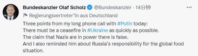 也是英国的天空新闻网朔尔茨也发推称,他和普京进行了"长期"谈话“今天,他与普京就三件事谈了很长一段时间:在乌克兰实现停火的迫切需要。”纳粹声称他们在那里当权是不正确的。我也强调俄罗斯应对全球粮食危机负责。