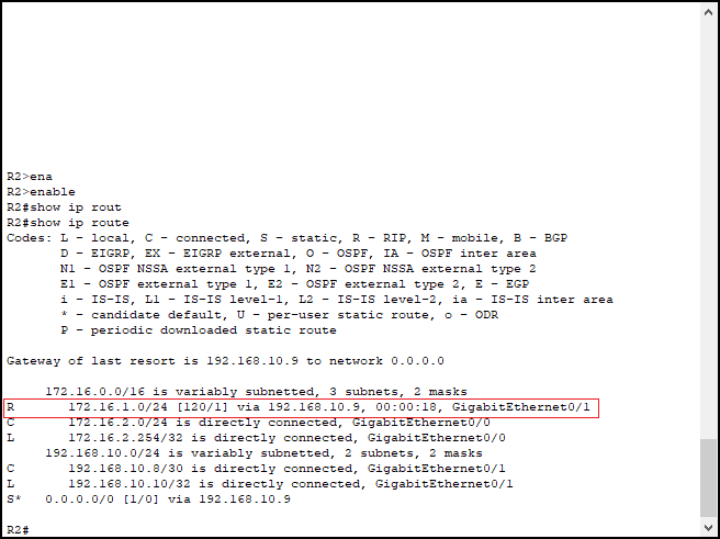 ---------->R2(config-router)#network 192.168.10.8 (路由器g0/1接口连接的网段)