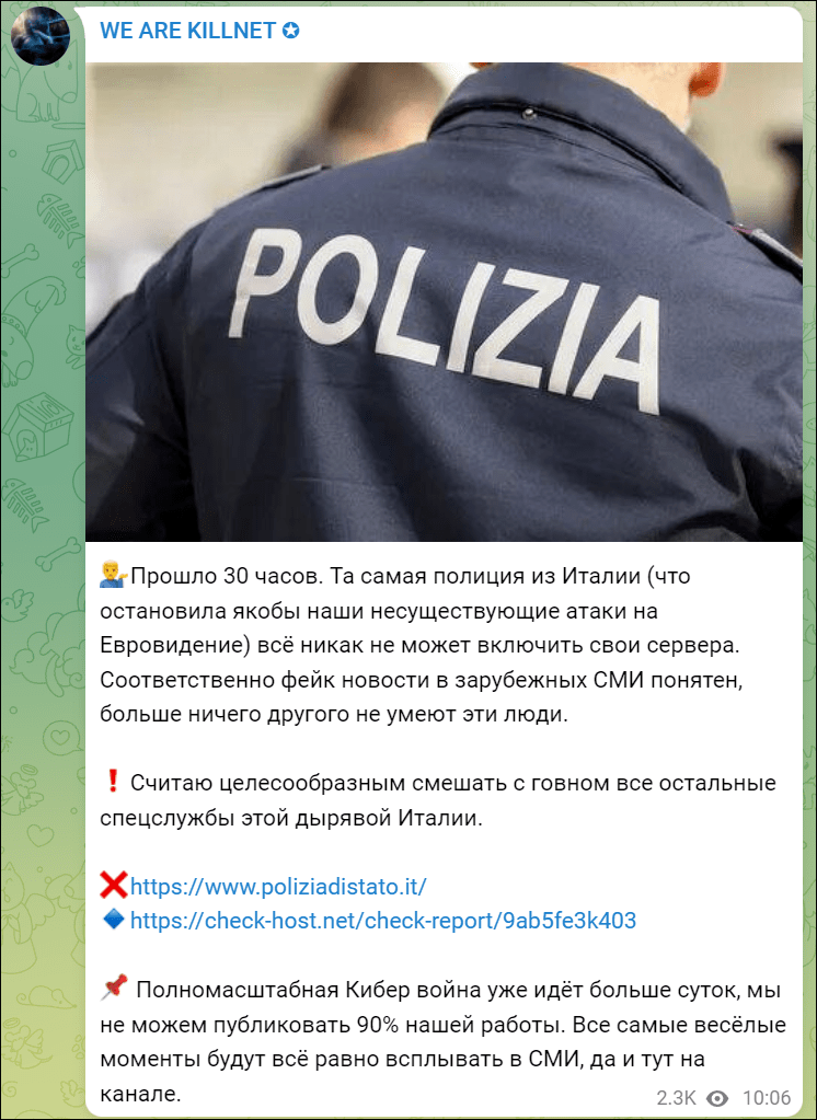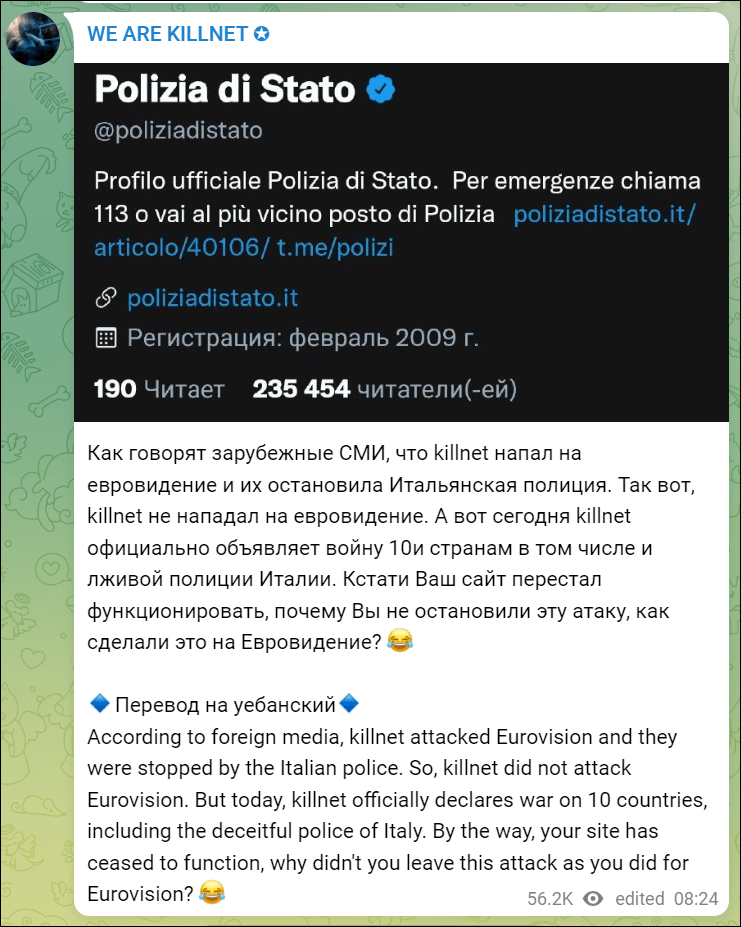 同一天,“Killnet”通过Telegram返回意大利国家警察(Polizia di Stato)。