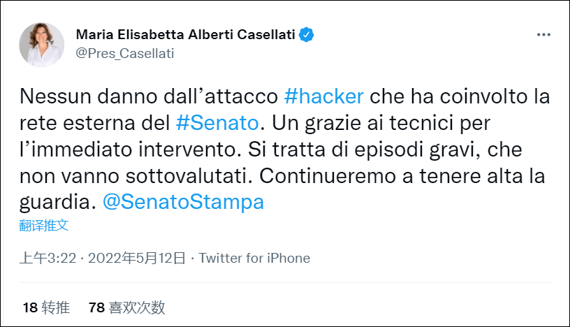 为了减轻忧虑,意大利参议院议长伊丽莎白·卡塞拉蒂说,网络攻击对参议院没有造成任何伤害。她说,“这些是不应低估的重大事件,我们将保持警惕。我不知道我该怎么办。”