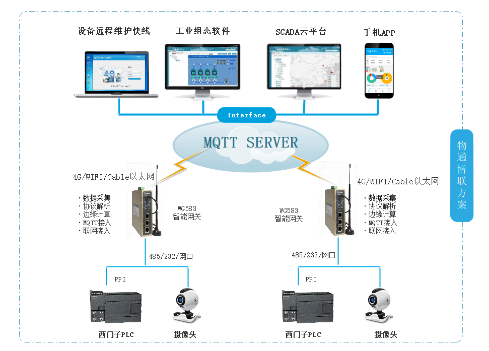 网站Siemens PLC与583工作组通过485/232/net链接。因特网将海运摄像头与第583工作组连接起来。WG583中嵌入的西门子协议求解器从Siemens plc的智能网关中提取数据,用于协议解释和边距计算。在数据标准化之后,MQTT协议被用来以JSON提交的形式接收云系统。这是一个大型屏幕演示, 计算机端,或手机端。实时监控。同时,总部有一个公共网络解决知识产权问题。数据可以直接发送到总部通常的分组程序,wincc。