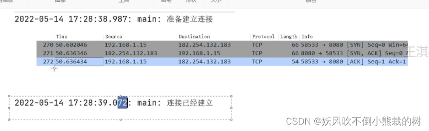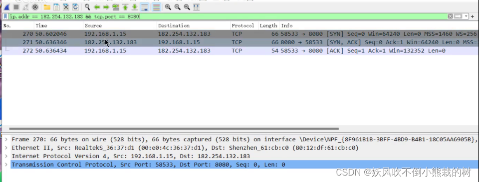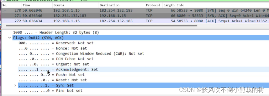 2号(从服务器到客户端):端口号被颠倒,从58533到8080,并带有SYN、ACK等符号。