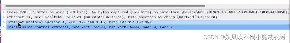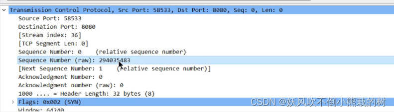 由于没有传输数据,信息从58533到8080标准SYN,序号0,Len:0。